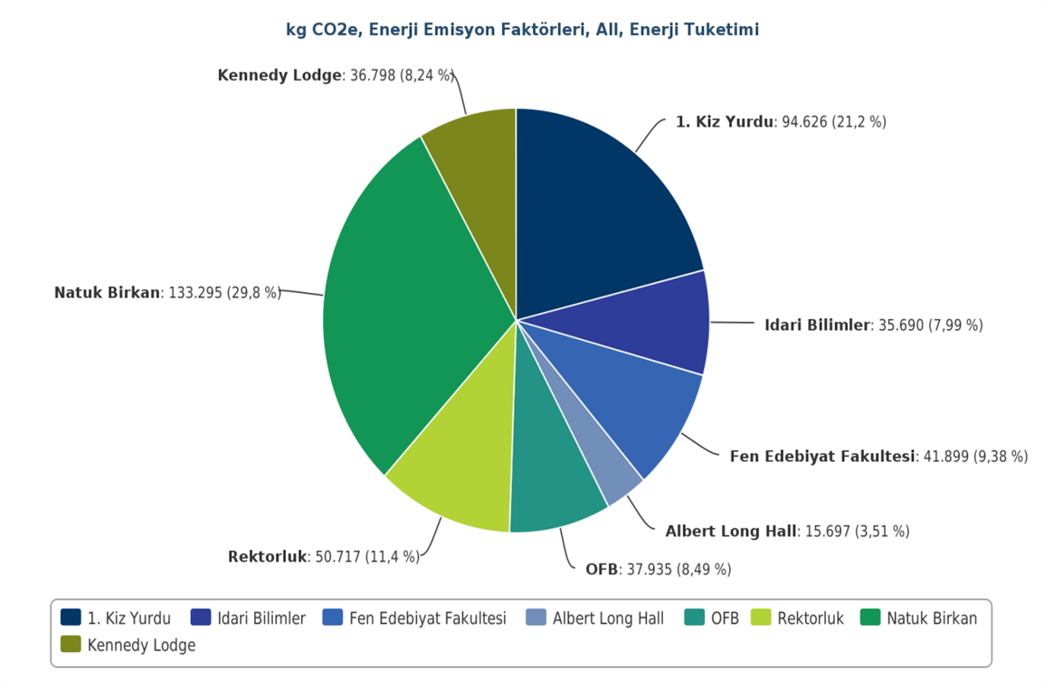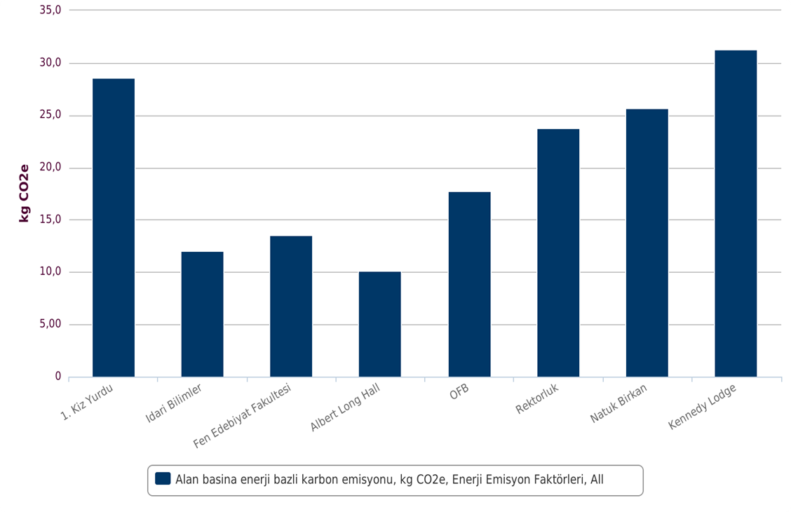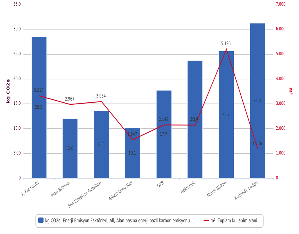Çalışma kapsamında, 1. Erkek Yurdu, 1. Kız Yurdu, Fen Edebiyat Fakültesi (FEF), İktisadi ve İdari Bilimler Fakültesi (İİBF), Rektörlük Binası, Natuk Birkan Binası, BTS Binası, Öğrenci Faaliyetleri Binası (ÖFB) ve Kennedy Lodge incelenmiştir. Yapılan hesaplamalarda elektrik, doğalgaz ve su tüketimleri göz önünde bulundurulmuştur.
